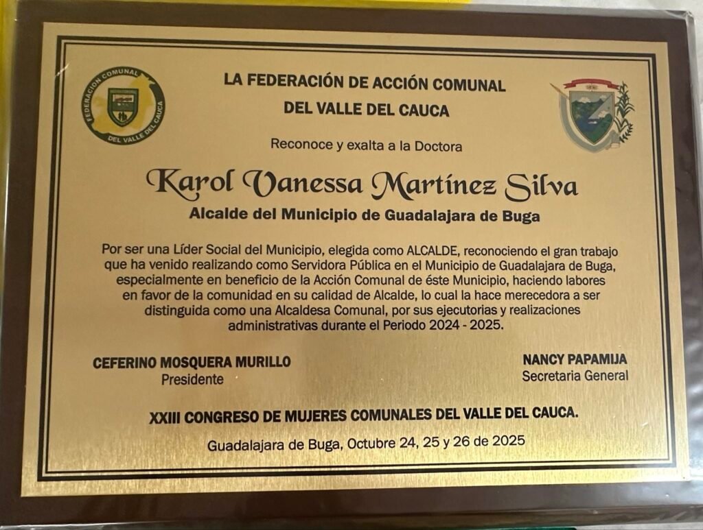 “La Federación de Acción Comunal del Valle del Cauca reconoce y exalta a la Doctora Karol Vanessa Martínez Silva, Alcaldesa del Municipio de Guadalajara de Buga, por ser una Líder Social del Municipio, elegida como alcaldesa, reconociendo el gran trabajo que ha venido realizando como servidora pública en el municipio de Guadalajara de Buga, especialmente en beneficio de la acción comunal de este municipio, haciendo labores en favor de la comunidad en su calidad de Alcaldesa, lo cual la hace merecedora a ser distinguida como una Alcaldesa Comunal, por sus ejecutorias y realizaciones administrativas durante el Periodo 2024 – 2025”, señala la placa entregada por Ceferino Mosquera Murillo, presidente de la Federación.